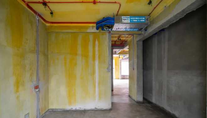 5、厚找平結(jié)束后,掛網(wǎng)格布,提升墻面穩(wěn)定性。