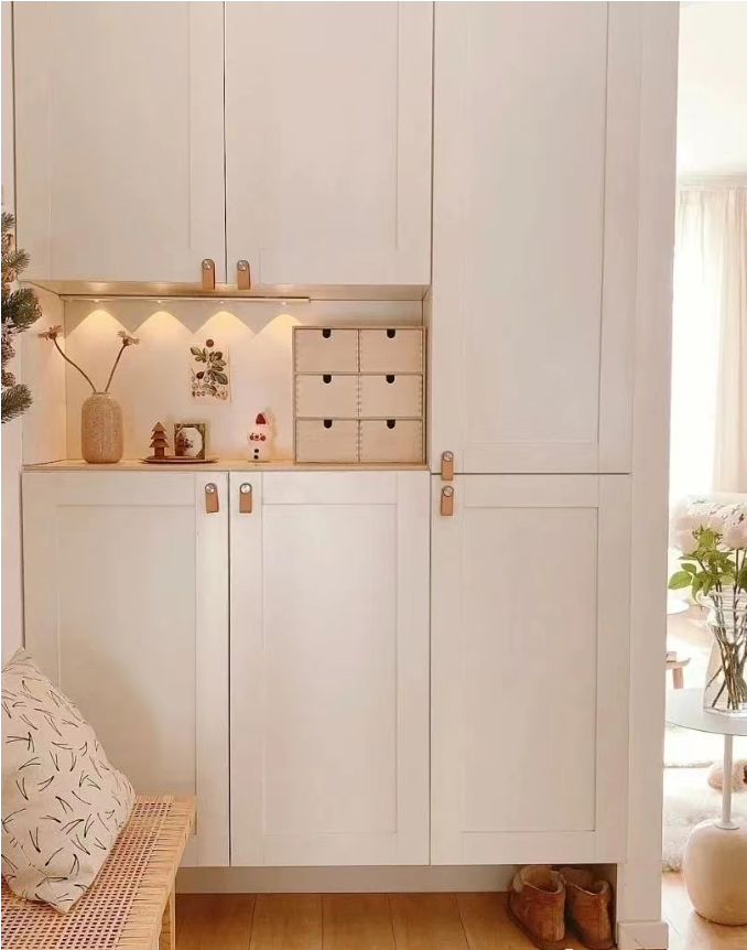 我們的入戶空間如果是做定制玄關柜,別忘了在底部預留10cm-30cm的懸空空間。這樣設計方便進出時放置一些常用的鞋子,節省時間還能讓空間更整潔。