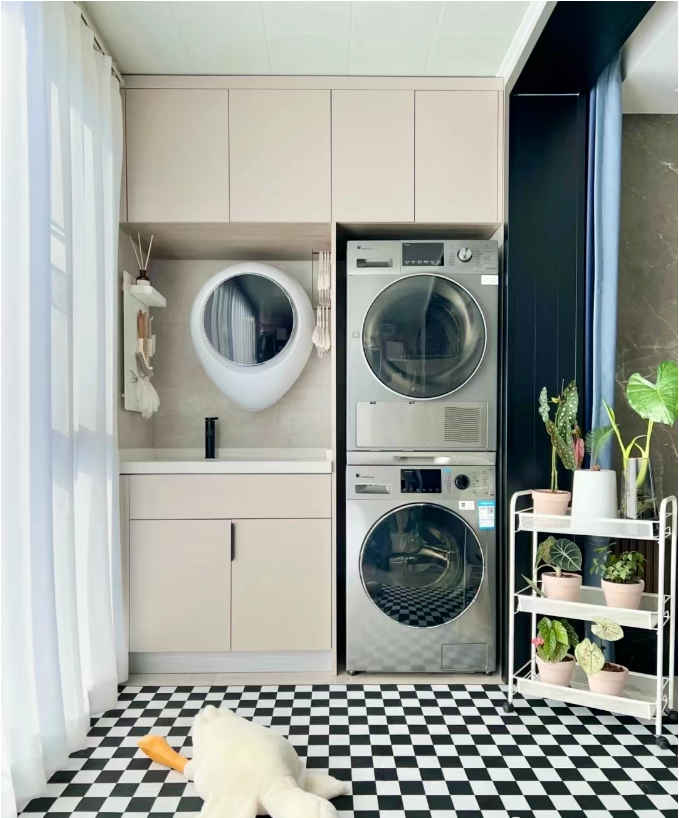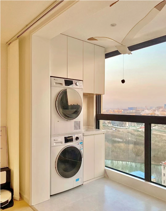 相信大家之前看過不少陽臺改造成書房、休閑區的文章,結果有很多朋友反饋還是做成洗衣房最合適,將陽臺劃分出洗衣區、晾衣區就能一步到位擁有“一體化”的洗衣房。而且還可以利用陽臺柜的收納做成儲物區,存放一些清潔用品或不常用的生活雜物,非常實用~