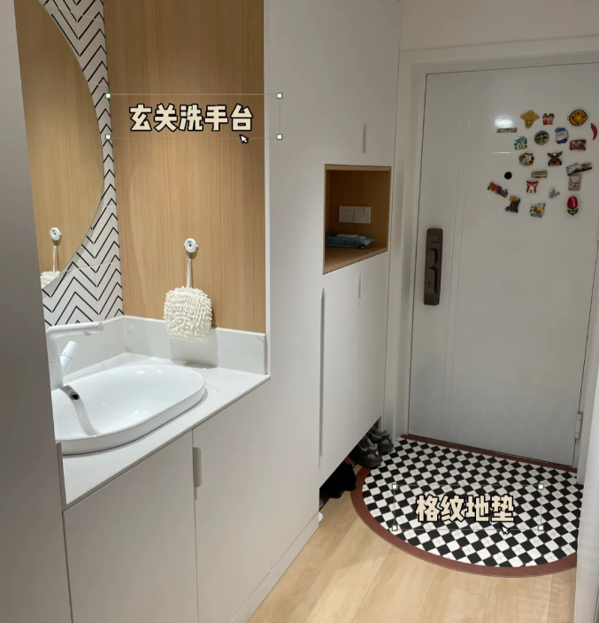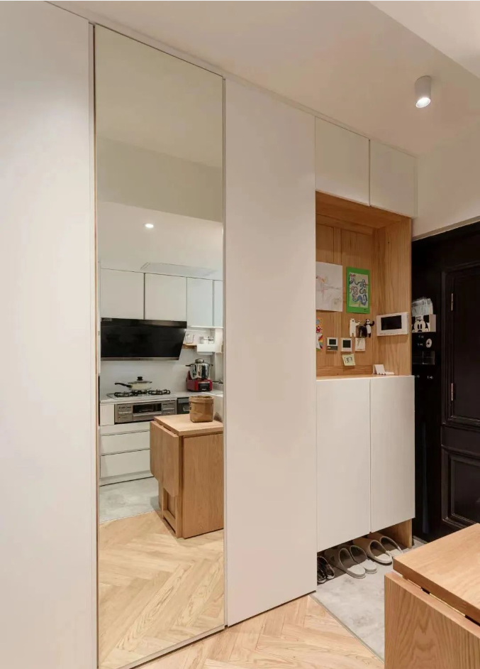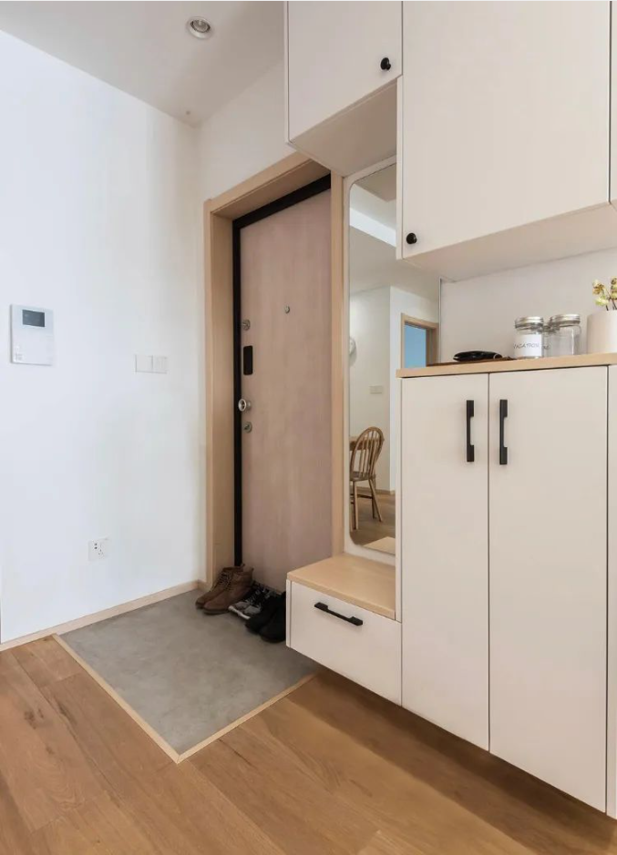 2、一體化玄關(guān)設(shè)計(jì):結(jié)合鞋柜、穿衣鏡、換鞋凳和洗手臺(tái),這樣的設(shè)計(jì)既節(jié)省空間,又功能豐富。