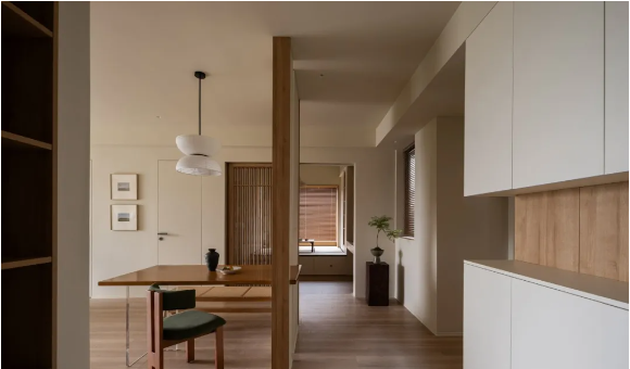 入戶以回歸自然為主旨,將傳統(tǒng)的可觀游園林設(shè)計(jì)手法帶入,餐桌的正中位置為點(diǎn),新建墻體,將玄關(guān)獨(dú)立。