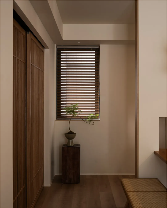 玄關(guān)左側(cè)以植物端景為列,右側(cè)上下定制透氣性更強(qiáng)的懸浮吊柜,用以日常鞋履的儲(chǔ)放。