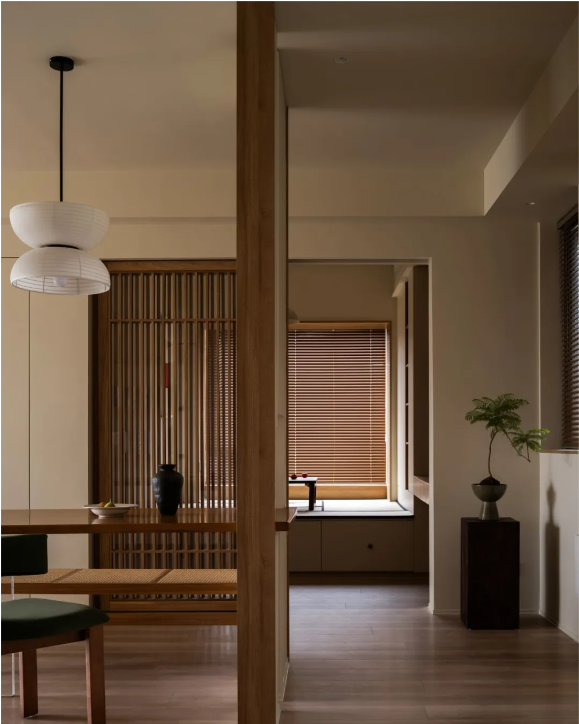 木柵推拉門(mén)可開(kāi)可合,內(nèi)外功能隨之互聯(lián),開(kāi)闊透亮之余,最大化放大空間視覺(jué)。