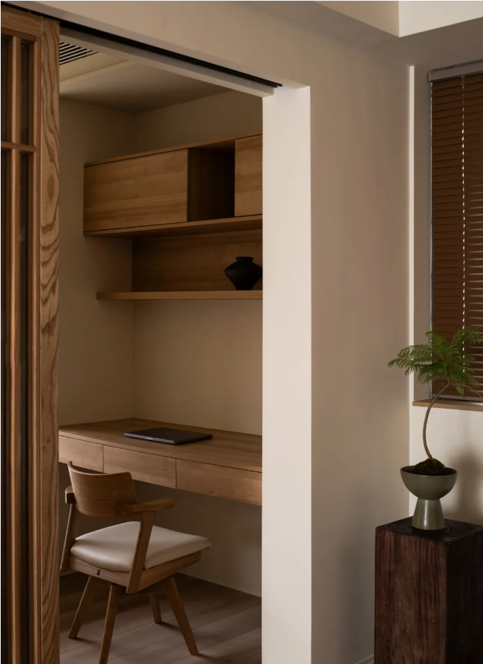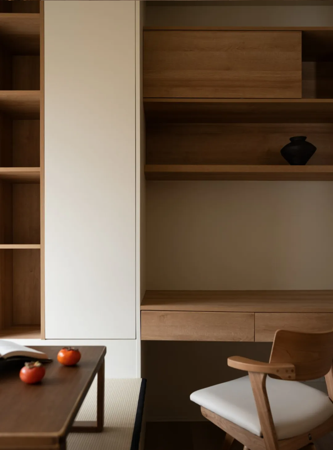 一間臥室,改變動(dòng)線后,設(shè)計(jì)為集辦公、儲(chǔ)物、閱讀、茶室、臨時(shí)客房一體的多功能空間。