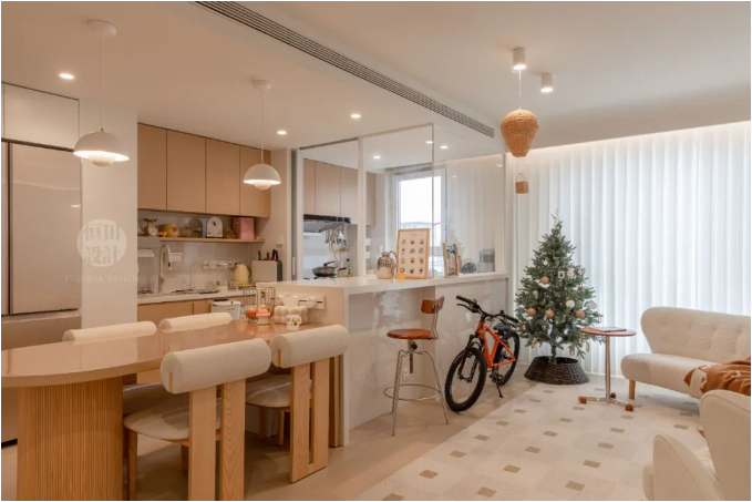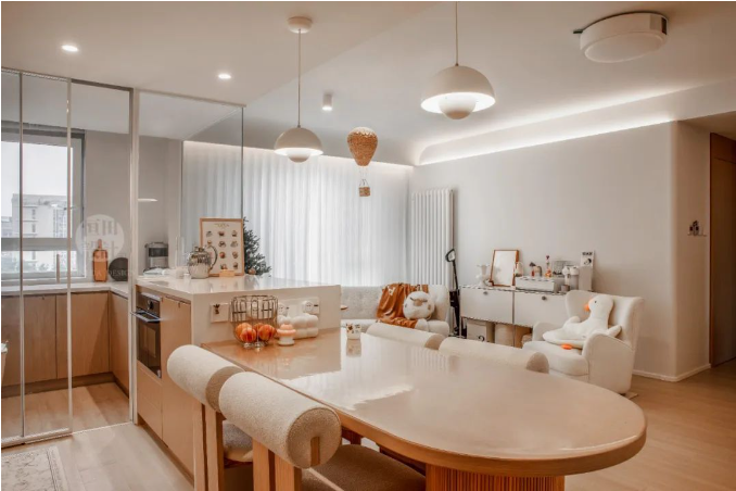 客餐廚三區(qū)無縫銜接,開放式布局讓空間感倍增,小戶型也能享受大宅的開闊視野。溫暖的奶油色調(diào)搭配柔和燈光,營(yíng)造出溫馨舒適的居家氛圍。