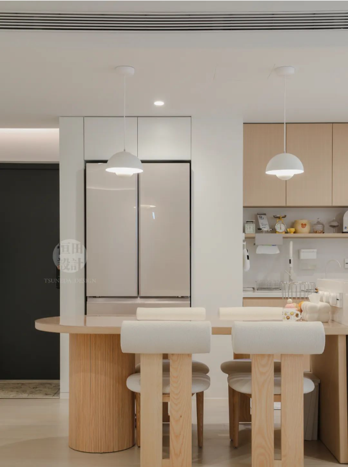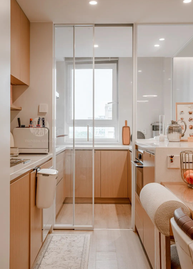 用玻璃隔開中廚區(qū),視線無阻礙,交流、互動(dòng)時(shí)刻發(fā)生。島臺(tái)內(nèi)凹20cm,用餐時(shí)會(huì)舒適很多。