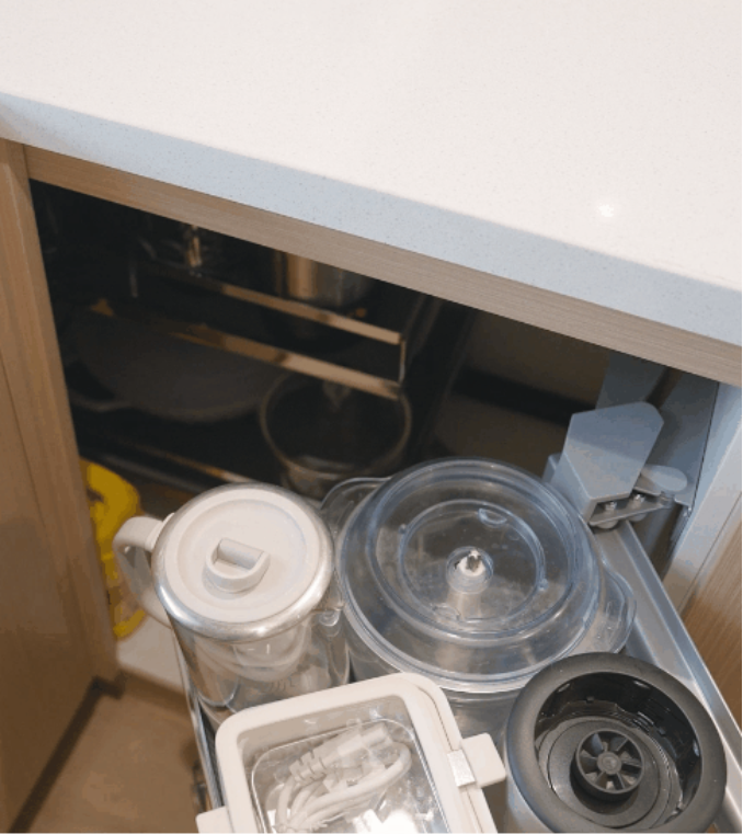 柜子轉(zhuǎn)角處物品拿取物品過于費(fèi)力?配置拉籃一鍵解決,釋放廚房死角空間。