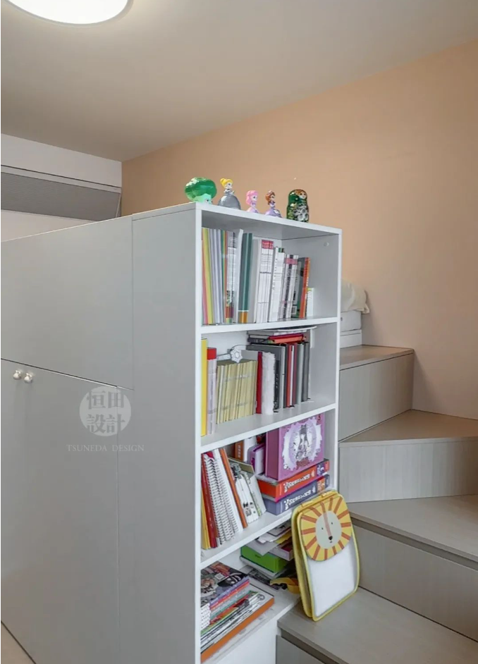 在這2.3m3的立面空間里,收納超乎想象。上方床、下方衣帽間、轉(zhuǎn)角處儲(chǔ)物抽屜,再加開放格書柜!嘎槿鸽m小,可五臟俱全」,落為現(xiàn)實(shí)。
