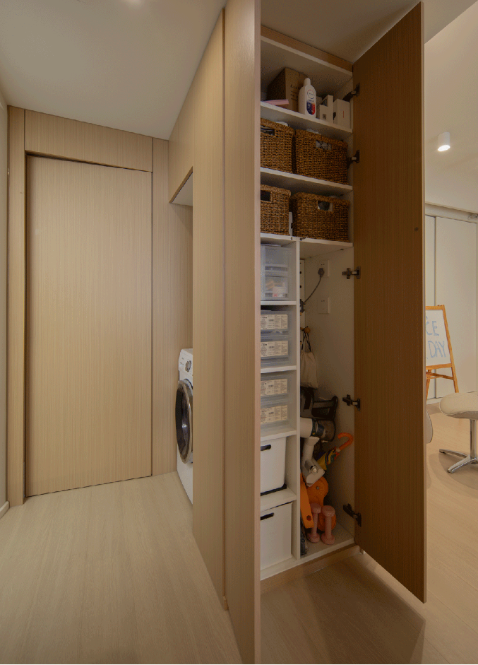 家政區(qū)位于全屋中心,清理房屋各處都十分方便。柜子內(nèi)部根據(jù)物品靈活布置,空間小更要細(xì)致規(guī)劃。